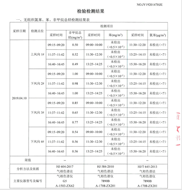 公司2019年4月10日至12日委托山東嘉源檢測(cè)技術(shù)公司對(duì)vocs進(jìn)行了檢測(cè),檢測(cè)結(jié)果如下圖:……